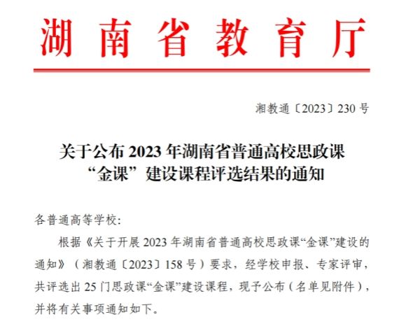 近日,湖南省教育厅发布《关于公布2023年湖南省普通高校思政课“金课”建设课程评选结果的通知》,beats365官方网站邢鹏飞副教授主持申报的《习近平新时代中国特色社会主义思想概论》课获批立项。至此,公司有5门思政课立项湖南省普通高校思政课“金课”建设项目,位居湖南省高校之首。