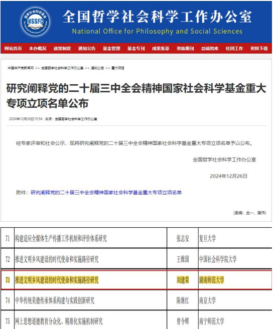 近日,全国哲学社会科学工作办公室公布研究阐释党的二十届三中全会精神国家社会科学基金重大专项立项名单。公司刘建荣教授申报的《推进文明乡风建设的时代使命和实施路径研究》获批立项。这是公司近年来第四个国家社会科学基金重大招标项目。