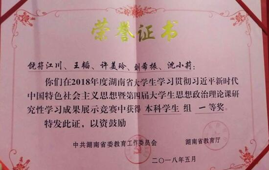 公司丁峰、吴家庆老师指导的公管院2017级社会学班饶符江川、王韬、许美玲、刘希振、沈小莉研究性学习团队以扎实的理论基础、严谨的推理演进、丰富的数据案例、优秀的展示答辩赢得评委的一致好评,从全省入围决赛的11所本科高校中脱颖而出,荣获一等奖。