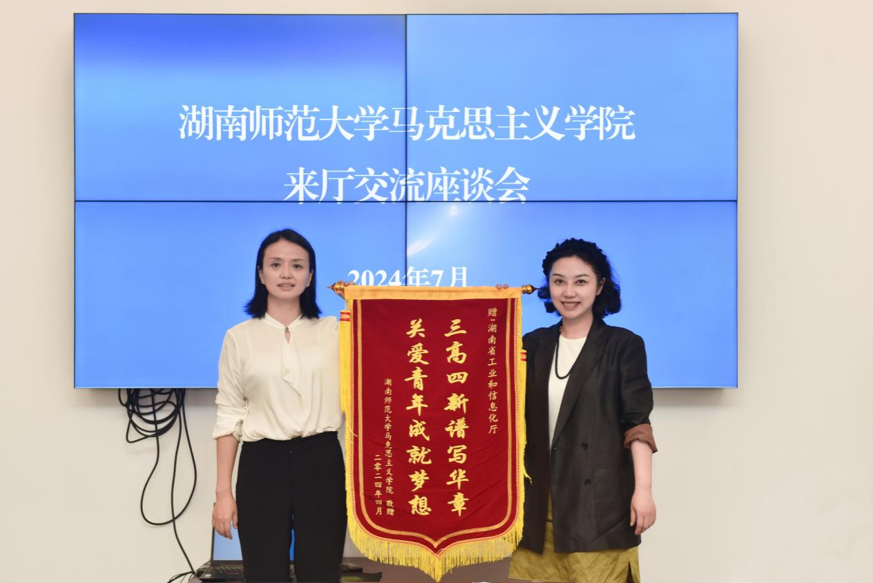(通讯员 曾力宁 吴虹佳)7月5日下午,湖南省工业和信息化厅与公司召开座谈会。公司党委副书记林峻,教师邓验、曾力宁带领秦莉媛、吴涵和吴虹佳3名员工参加座谈会并赠送锦旗,对省工信厅给予公司参赛团队的大力支持表示感谢。