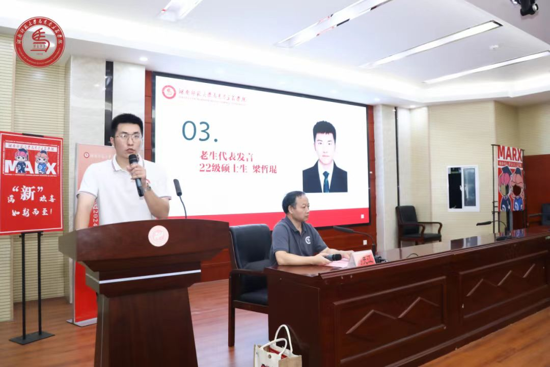 2022级硕士研究生梁哲琨表达了对新生的祝愿,分享了自己的学习感悟,鼓励他们以“勤勉”“担当”“坚持”的态度对待未来的研究生生活。