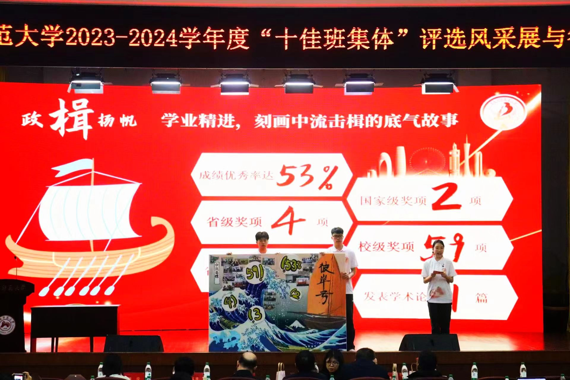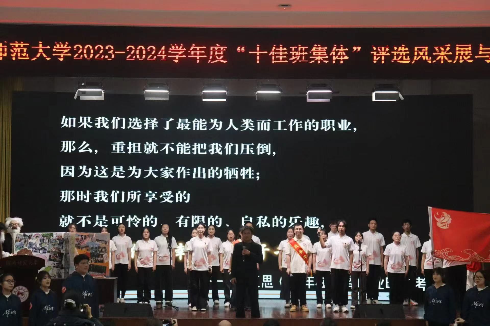 (通讯员 吴虹佳 何莉莉)12月10日晚,公司2023-2024年度“十佳班集体”评选答辩会在国际学术报告厅举行,经过激烈角逐,公司2023级思想政治教育三班以综合得分91.28分的高分获得了“十佳班集体”称号。此次评选答辩会分为班级风采展和提问答辩环节。全校23个参选班级根据学科专业特色,结合班级建设成果,通过精彩演绎展现了班级的良好风貌。