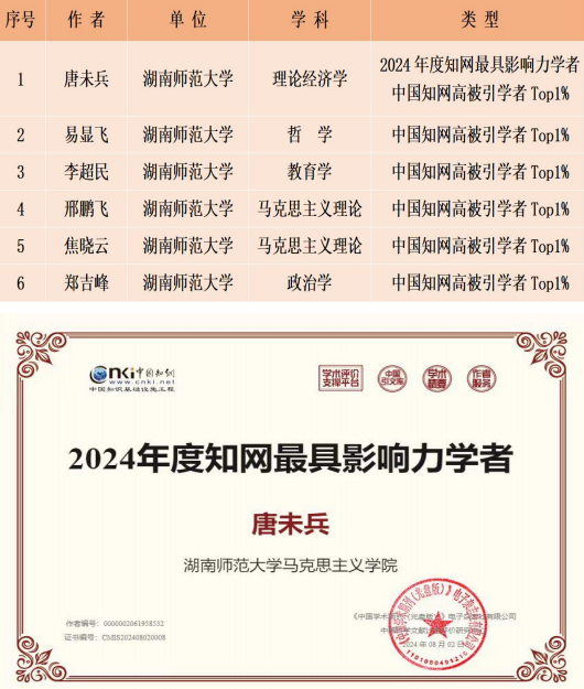 近日,中国知网发布“2024年度中国知网最具影响力学者”和“中国知网高被引学者TOP1%”榜单。beats365官方网站唐未兵教授荣获“2024年度知网最具影响力学者”称号;唐未兵教授、易显飞教授、李超民教授、邢鹏飞教授、焦晓云副教授、郑吉峰副教授等入选“中国知网高被引学者TOP1%”榜单。