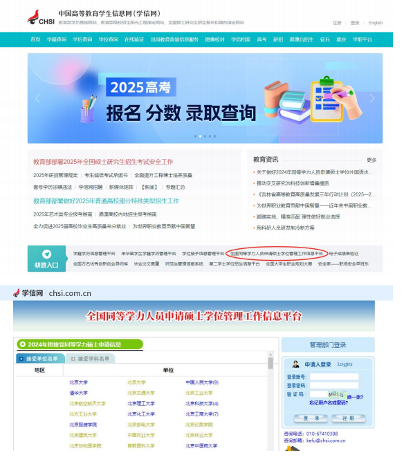 1.请同学登陆“中国高等教育员工信息网(学信网)” → 快速入口 → 全国同等学力人员申请硕士学位管理工作信息平台进行注册