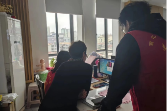 志愿者协助社区居民打卡签到