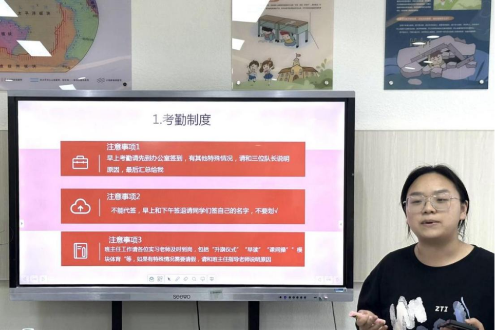 各小组组长依次汇报各小组近期的工作落实情况,并详细说明了后续的工作安排。随后,24名实习队员就前期的班主任工作和教学工作方面的收获与反思进行分享。