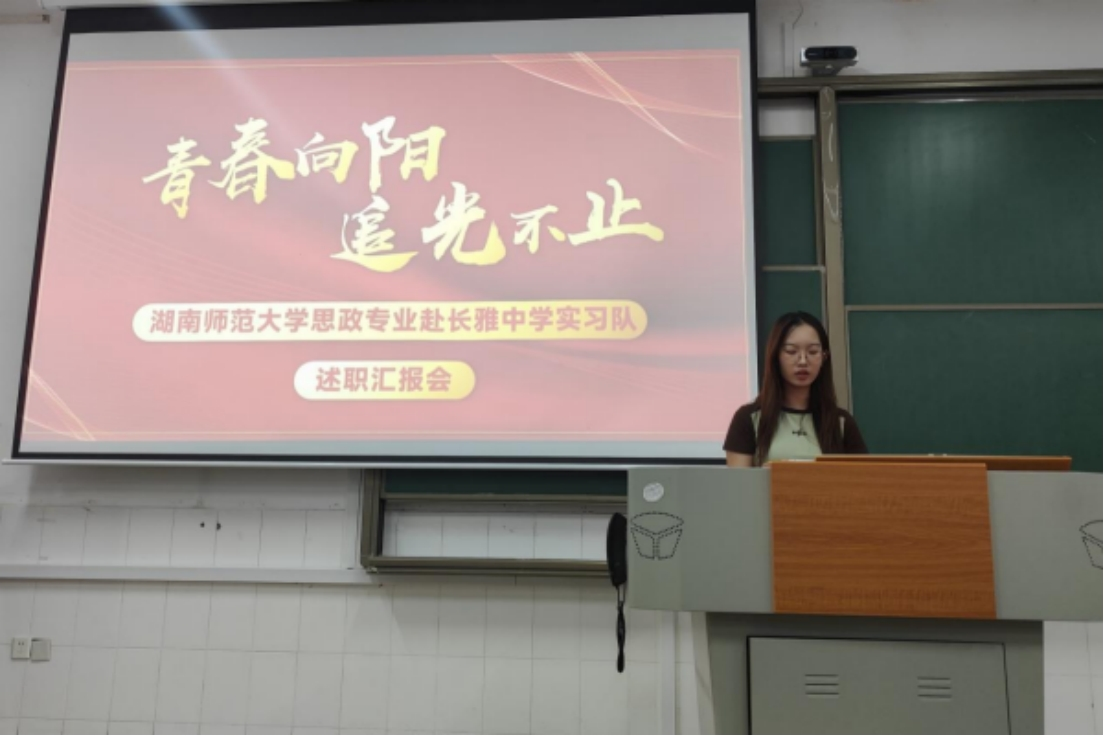 实习队员们依次登台,从教学实践、班级管理、宣传报道、学术调研、团队协作及个人特殊贡献六个方面,全面回顾了他们在长雅中学的实习历程,分享了各自的体验和感悟。他们的汇报内容详实,充分展示了对教育事业的热忱和扎实的专业基础。