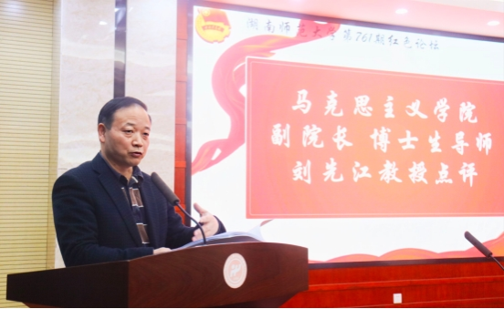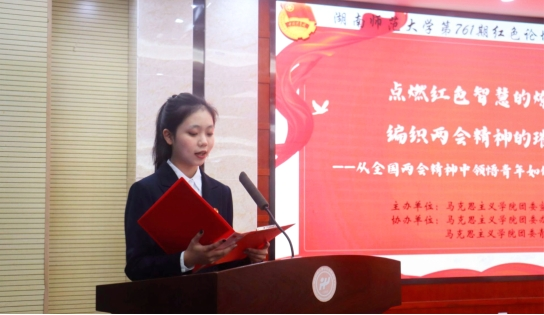 活动伊始,主持人介绍了此次红色论坛的主题及意义,全体成员合唱共青团团歌。随后,覃宇、郑艳菲、袁乐怡、王尔涵、秦佳期五位主讲人结合自身阅读经典的心得体会,回答了“青年该如何从两会精神中汲取力量助力祖国繁荣昌盛”这一问题。同时,各小组成员还进行了朗诵、合唱、情景剧等多种形式的特色表演。活动的最后,刘先江对此次红色论坛活动进行点评总结,充分肯定了同学们的研读成果,同时指出同学们需注重文献出处,要将理论原理与感悟启示联系起来,尽量避免出现“两张皮”问题,并鼓励同学们要让“读经典,悟原理”成为习惯。