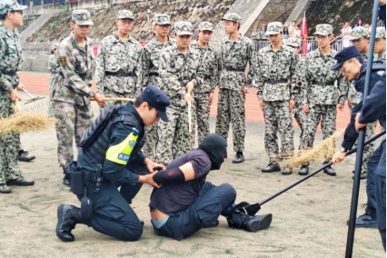 防恐防暴训练环节模拟了“歹徒”持械突然闯入校园的突发场景。在专业指挥下,员工代表迅速进入应急处置状态,利用防暴盾、钢叉等器械进行协同防卫,并通过擒拿控制技巧有效限制“歹徒”行动,最终成功实施合围并将其制服