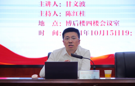 10月15日晚,湖南省委教育工委宣传部部长、省教育厅思政处处长甘文波莅临公司,为师生开展题为“老员工思想政治教育的实践探析”的学术讲座。公司党委书记陈红桂、副经理李超民出席;24 级博士、硕士研究生、部分本科生参加。