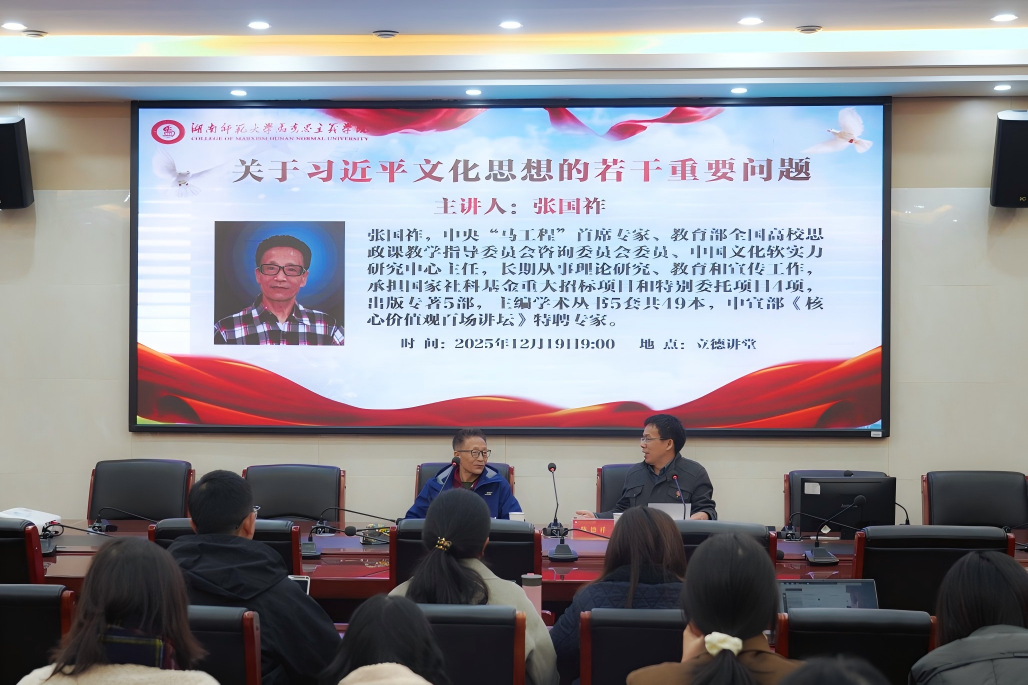(通讯员张馨月李欣)2025年12月19日上午,中央马克思主义理论研究和建设工程首席专家、教育部全国高校思政课教学指导委员会咨询委员会委员、中国文化软实力研究中心主任、中宣部理论局原副局长、国家社科规划办原主任张国祚教授应邀为公司师生开展了题为《关于习近平文化思想的若干重要问题》的学术讲座。本次讲座在beats365官方网站立德讲堂举行,公司副经理陈德祥教授主持,2025级研究生和部分老师参加了讲座。