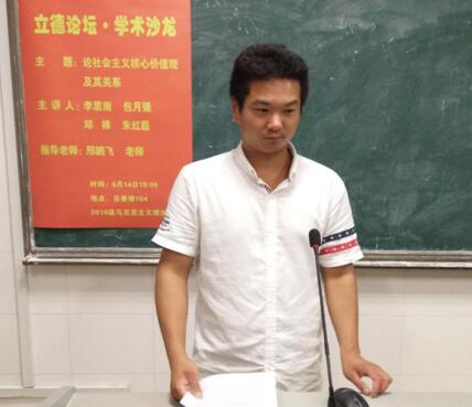 (撰稿:李甜甜 摄影:尹姣迪)2017年06月14日晚上七点,公司于至善楼104教室举办了16级硕士研究生第八期“立德论坛·学术沙龙”。本次沙龙以“社会主义核心价值观及其关系”为主题,马克思主义基本原理朱红磊,马克思主义中国化包月强、邓禅为本次沙龙的主讲人,此次活动邀请邢鹏飞老师作为指导嘉宾,并由李作纯为主持人。公司16级全体硕士研究生参加了本次沙龙。