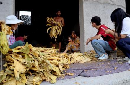 在对天门山水库的调研中,队员们了解到当地以烟草种植为重要经济来源。随后队员对天门山水库附近的村民进行访谈,访谈内容主要包括天门山水库的开发状况与当地烟草产业发展状况。在访谈过程中,我们了解到当地烟草种植并未形成较大种植规模,主要依靠人力收割与晾晒。