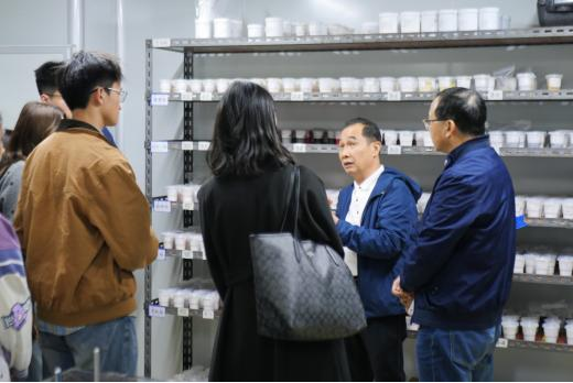 随后,研学团成员在彭建炎和黄超亮的带领下到广东金戈新材料股份有限公司工厂进行参观,了解工厂的基础设施与工作流程。思想政治教育专业2000级优秀员工喻晓坤与研学团成员见面交谈,了解研学团学习情况,并对接下来的研学活动做出指导。