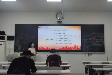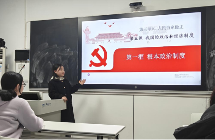 此次实习队集体试讲分为高中组与初中组,高中组成员试讲的内容为部编版高中思想政治教材必修三《政治与法治》第七课《治国理政的基本方式》,初中组成员试讲的内容为部编版教材八年级下册《道德与法治》第五课《我国的政治和经济制度》。在试讲过程中,高中组成员寻根溯源,通过历史分析法阐释我国法治建设历程;初中组成员借用时事热点,深入浅出地剖析制度特征。
