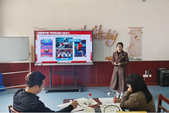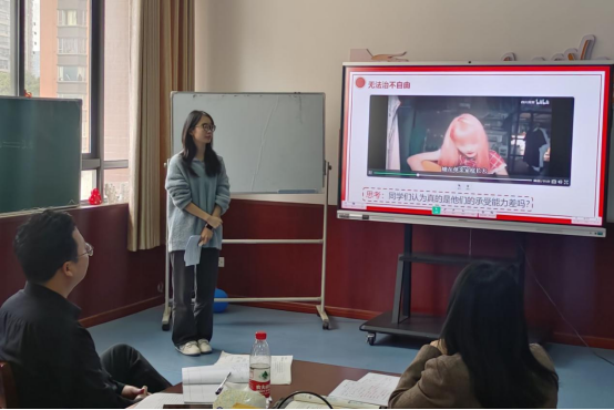 试讲聚焦“自由与法治的关系”“平等的意义”等教学重难点。三位实习教师各有特色,实习教师覃安琪采用知识回顾导入法,搭建新旧知识衔接桥梁;宋颖创新运用以兵乓球为教学主线,其板书设计巧妙融合乒乓元素,实现情境创设与知识呈现的有机统一;周贝以当代年轻人的“花式自由”导入,结合短视频案例解析“无法治不自由”的核心要义。