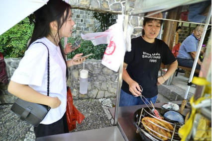 实践团成员首先赴清水村“雷公洞”景区进行实地考察。调研组成员系统记录目标区域的植被分布特征并勘察周边山体的地质构造特征。在清水村百寿广场上,调研组六名成员均分为三组,对百寿广场周边村民、游客以及商贩开展访谈与问卷调查工作。调研一组实地访谈村民,就村庄生态变化认知及绿色文旅对生活的影响开展调研。调研二组通过采访当地商贩,了解其经营项目、收入变化以及对文旅发展带动收入增长的诉求。调研三组向游客发放问卷,内容涵盖对清水村自然环境、生态保护举措的满意度以及对绿色文旅项目的建议等。